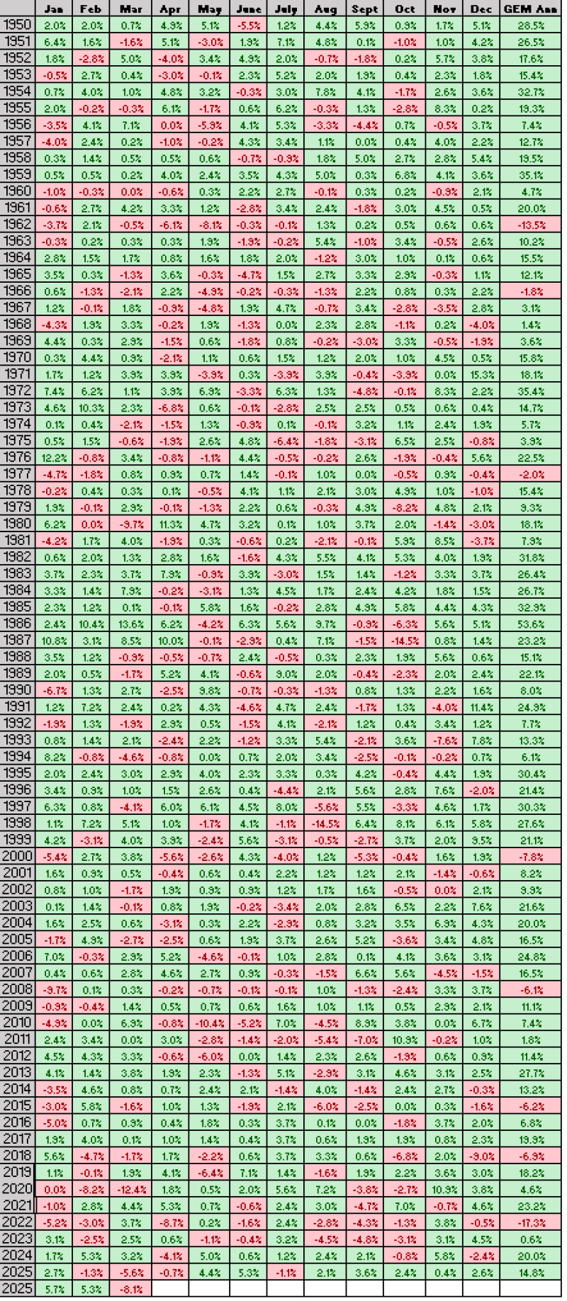 Global Equities Momentum (GEM) is a rules-based approach using relative and absolute momentum applied to the following indexes: Standard & Poor’s 500, MSCI All Country World ex-US (MSCI World ex-US from 1970 to 1988 and Global Financial Data World ex-US prior to 1970) and Barclays Capital US Aggregate Bond (Ibbotson US Intermediate Government Bond prior to 1976). Relative momentum looks for strength relative to other assets, while absolute momentum looks for positive past returns in excess of US Treasury bill returns. GEM positions are reevaluated monthly. The Global Asset Allocation BENCHMARK is weighted 45% Standard & Poor’s 500, 27% Barclays Capital US Aggregate Bond (Ibbotson Intermediate Government Bond prior to 1976), and 28% MSCI All Country World ex-US (MSCI World ex-US from 1970 to 1988 and Global Financial Data World ex-US prior to 1970), which are the average allocations to GEM. Rules for determining GEM positions are in Dual Momentum Investing: An Innovative Strategy for Higher Returns with Less Risk. GEM performance does not represent actual fund or portfolio performance. All performance represents total returns and includes reinvestment of interest and dividends but does not reflect management fees, transaction costs, taxes, or other expenses. Historical data and analysis should not be taken as an indication or guarantee of future performance. Future performance of GEM may differ significantly from historical performance. Please see our Disclaimer page for additional disclosures.