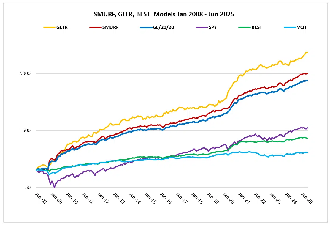 SMURF is a stock market oriented model that combines mean reversion with trend and short-term calendar anomalies. It buys large-cap U.S. stock ETFs when their trends are positive. It can also buy non-U.S. ETFs for turn-of-the-month trades and other stock market ETFs for short-term mean reversion trades. SMURF exits when trends are no longer positive or on abnormal strength. When not in these ETFs, SMURF holds the BEST bond positions.