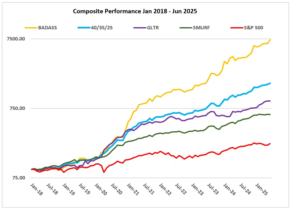 BADASS applies our trend model mainly to the BLOK ETF, representing blockchain technology stocks. It also allocates a smaller amount to spot Ethereum ETFs when their trends are positive. This combination gives better risk-adjusted results than either alone. When not in these ETFs, BADASS holds the SMURF, GLTR or BEST positions. BADASS has been our most profitable model.