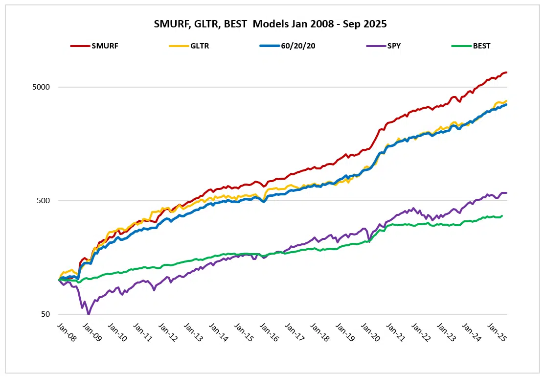 SMURF is a stock market oriented model that combines mean reversion with trend and short-term calendar anomalies. It buys large-cap U.S. stock ETFs when their trends are positive. It also buys stock market ETFs for calendar anomaly and short-term mean reversion trades. SMURF exits when trends are no longer positive or on abnormal strength. When not in these ETFs, SMURF holds the BEST bond positions.
