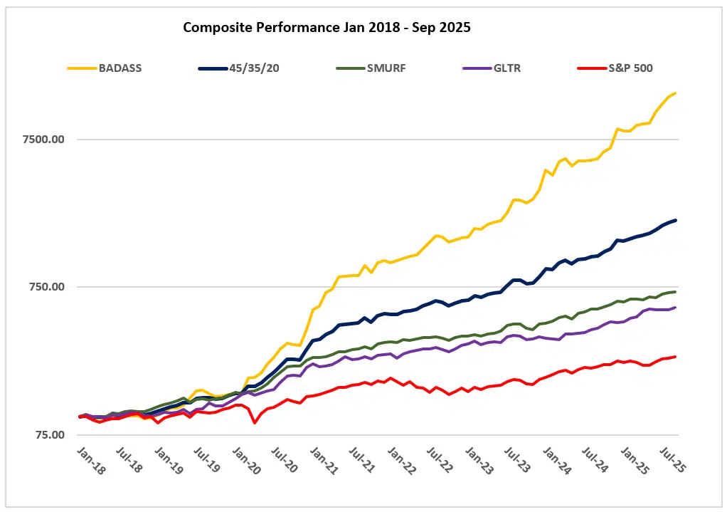 BADASS applies our trend model mainly to the BLOK ETF, representing blockchain technology stocks. It also allocates smaller amounts to other blockchain technology and spot Ethereum ETFs when their trends are positive. BADASS has been our most profitable model.