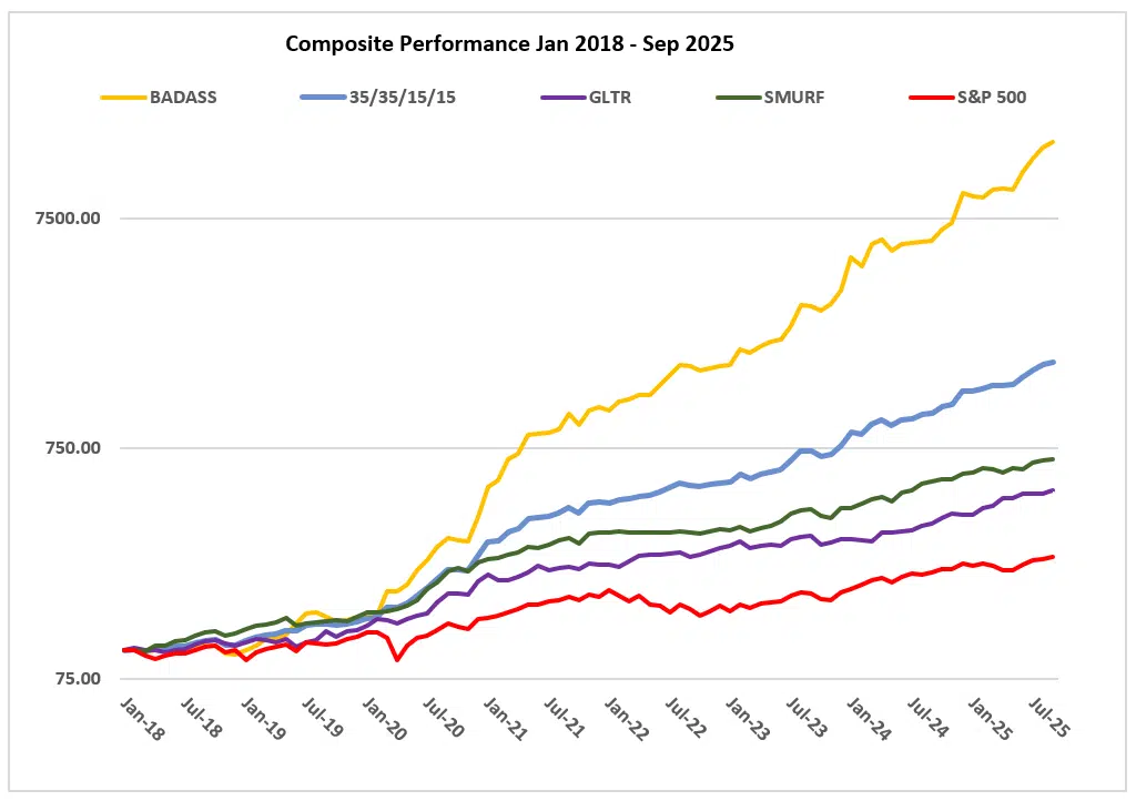 BADASS applies our trend model mostly to the BLOK and BITQ ETFs, representing blockchain technology stocks. It also allocates a small amount to a spot Ethereum ETF when its trend is positive. BADASS has been our most profitable model.