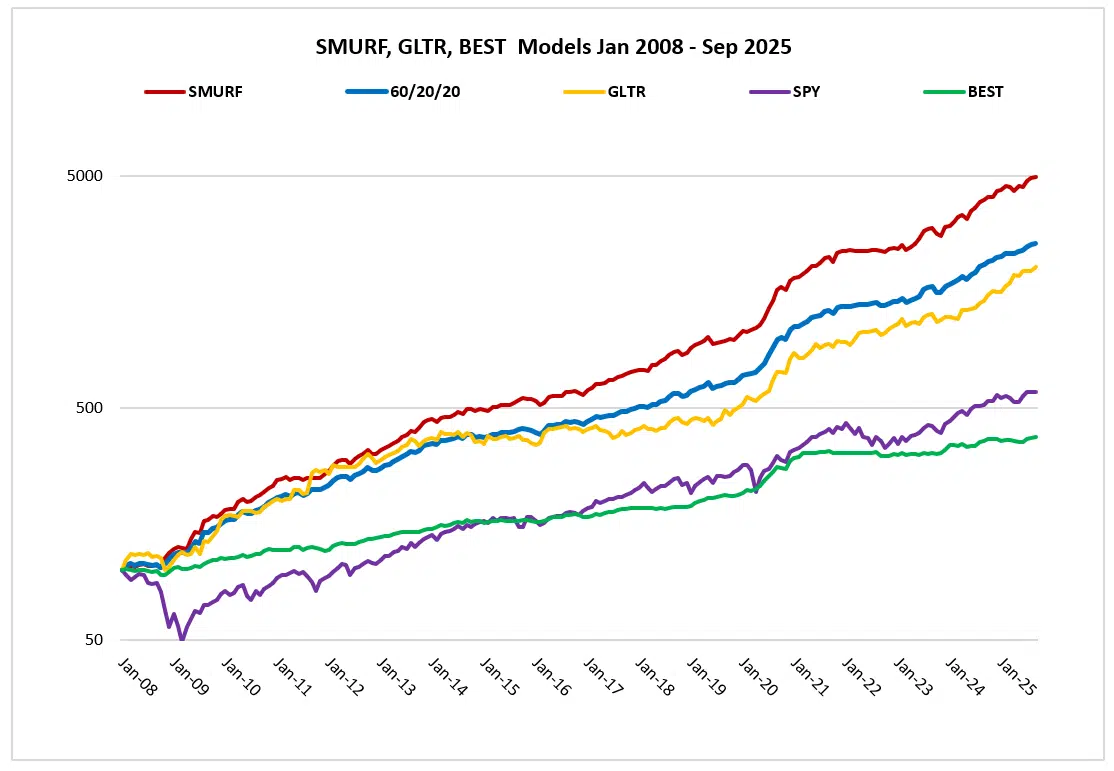 SMURF is a stock market oriented model that combines mean reversion with trend and short-term calendar anomalies. It buys mega-cap U.S. stock ETFs when their trends are positive. It also buys stock market ETFs for calendar anomaly and short-term mean reversion trades. SMURF exits when trends are no longer positive or on abnormal strength. When stock trends are not positive, SMURF holds the BEST model’s bond positions.